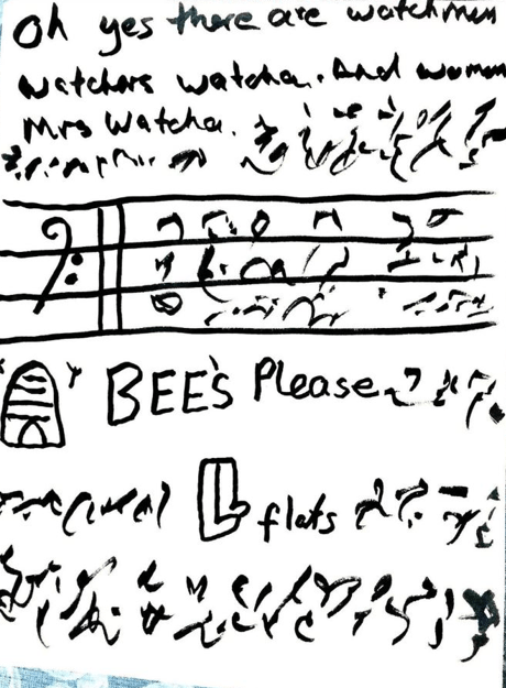 Emily Trim, automatic writing illustration referencing watchers, watchmen and Mrs Watcha, a childhood teacher from Zimbabwe.