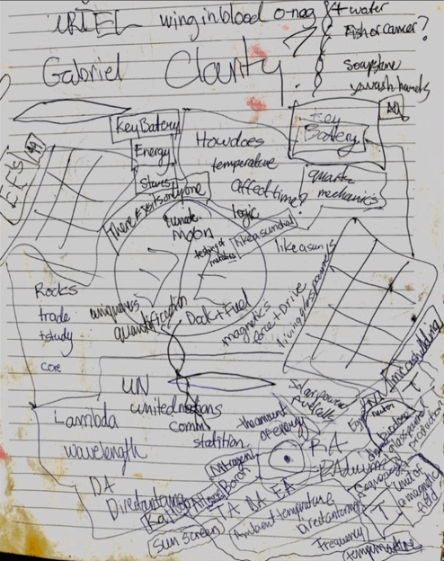 One of Emily’s most striking illustrations features scientific symbols scattered across the page, yet in the upper corner she wrote two names: Gabriel and Uriel. Beside them she added brief but revealing annotations — linking Gabriel to clarity and Uriel to the O-negative blood type.